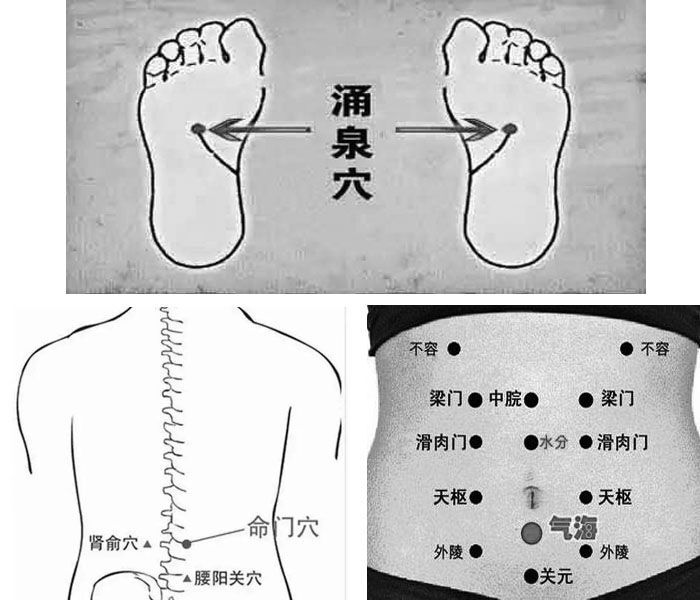同样的,小编也给男士们恶补一下穴位知识,让男士们看到小编的文章后,边泡边按,达到最佳效果。肾为先天之本,是生命的本源,涌泉穴在脚心,是肾经的起始穴,按摩涌泉穴相当于刺激肾经。肾俞(膀胱经)和命门(督脉)在后腰,关元和气海(二者都属于任脉)在前腹部(肚脐眼以下)。这四个穴位虽然分属不同的经络,但都对身体的生殖系统有好处。