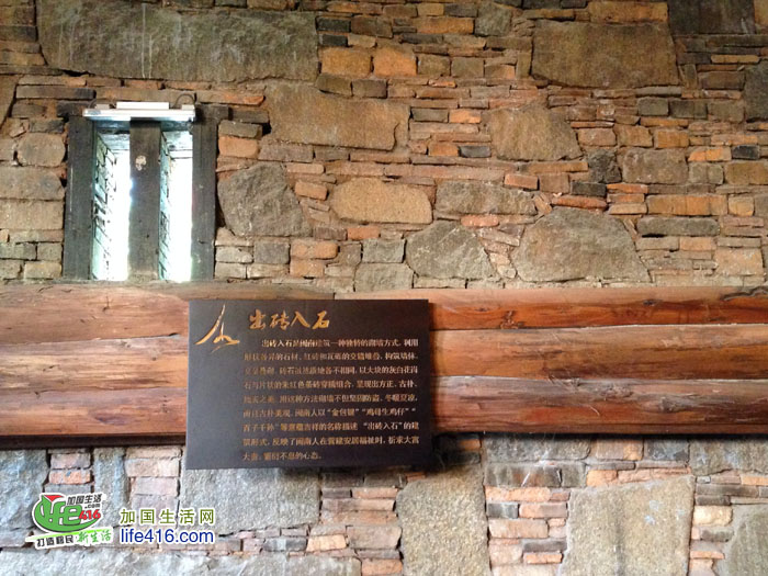 “出砖入石”是闽南建筑一种独特的砌墙方式,利用形状各异的石材、红砖和瓦砾的交错堆叠,构筑墙体,交垒叠砌。砖石虽然质地各不相同,但用这种方法砌墙不但坚固防盗、冬暖夏凉,而且古朴美观。因而,被人们广泛采用,沿袭成风,成为我国民居建筑艺术的一大奇景。