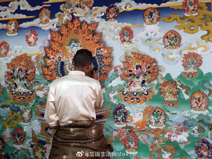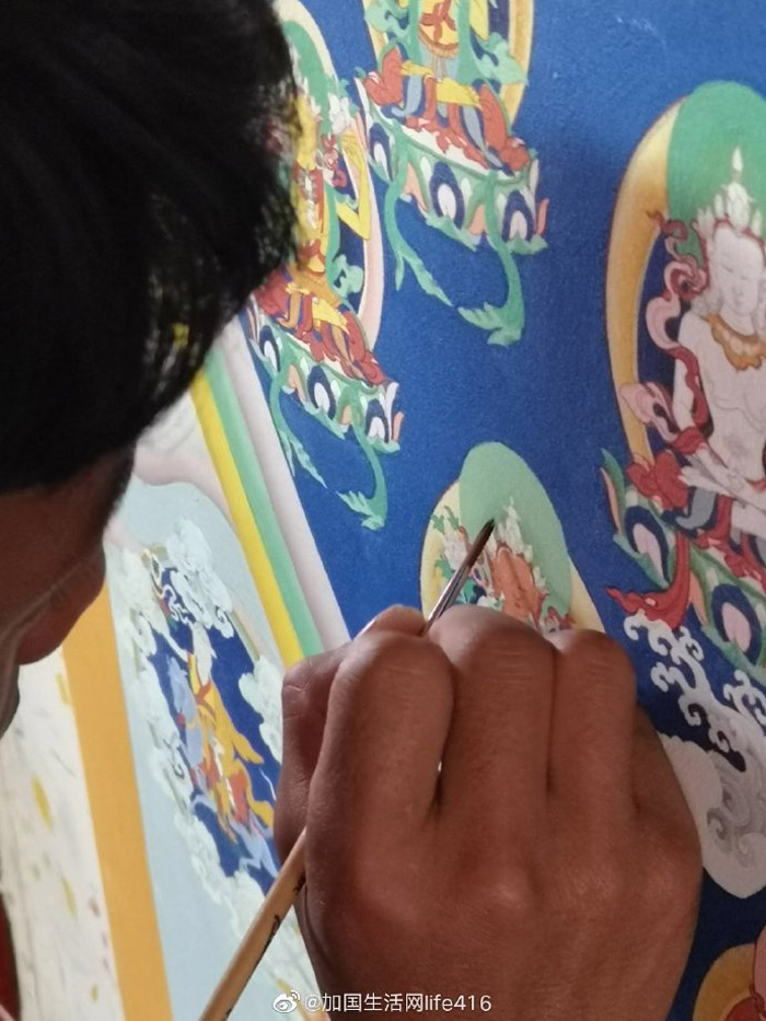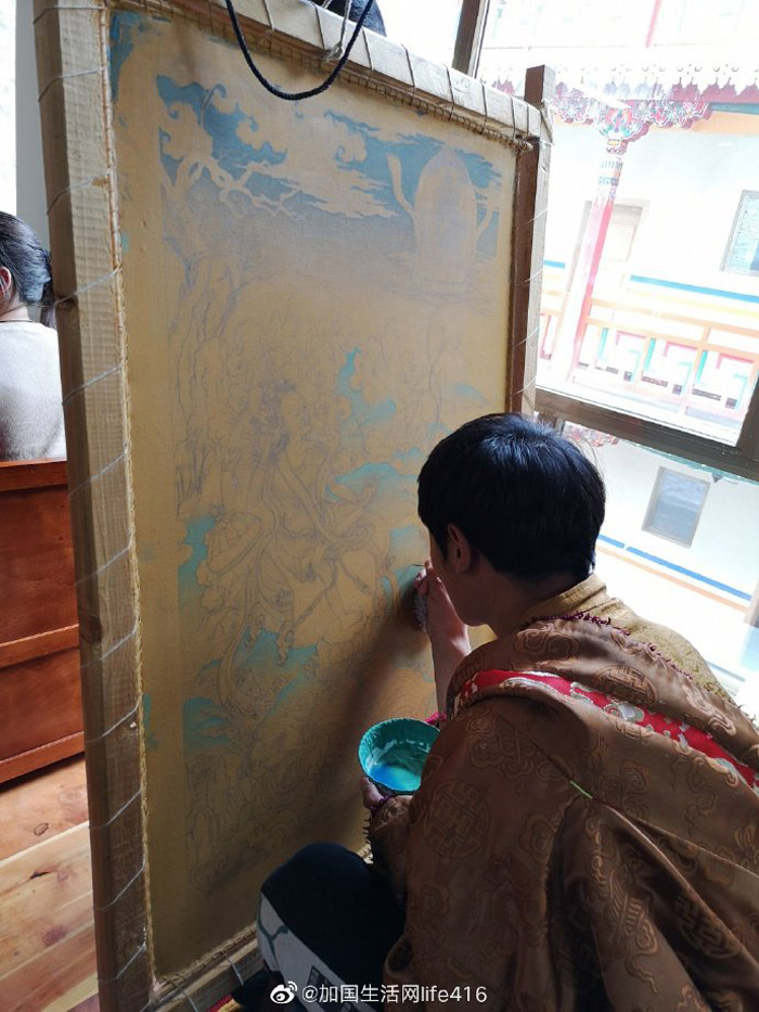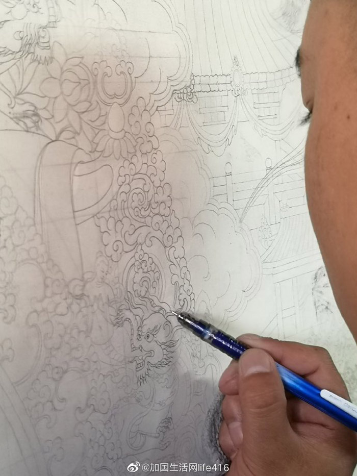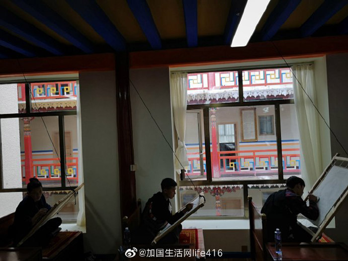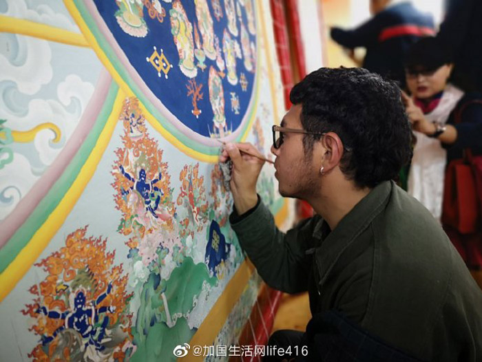 在这里,加国生活网小编一定要用一些照片来描述一下学生们是如何绘制唐卡的。唐卡的创作过程非常讲究、复杂,从准备画布、定位起稿、铺底着色,到精心勾勒、描银铺金,其过程一点也不能马虎。象藏艺术学校学生们完成一幅唐卡毕业作品往往需要三年时间。当你仔细看唐卡里的那些极细极细的线条和艳丽的色彩,你就知道为何完成一副唐卡作品要那么久了。