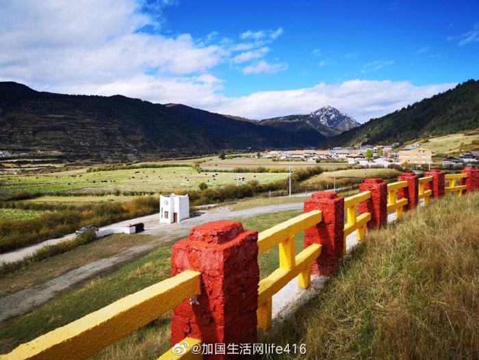 当踏上学校的最高一层台阶,回头再望,一片壮丽的风景展现在眼前,广阔农田深处的一个个黑点其实是一头头牦牛