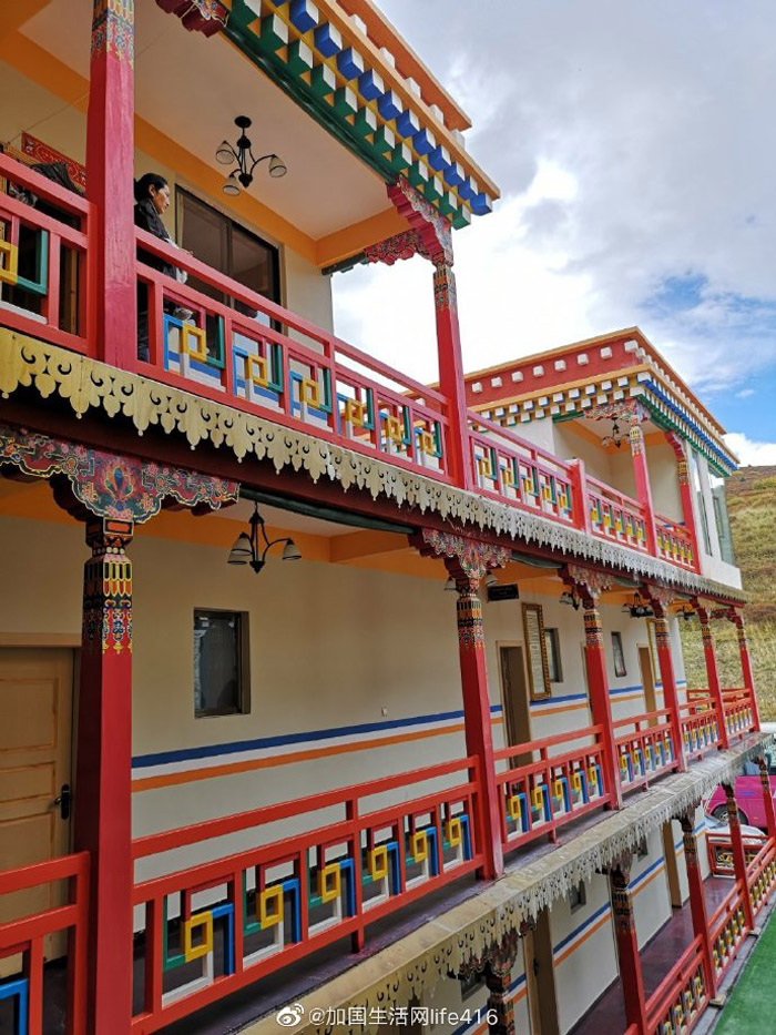 蓝天白云下,一座干净整洁的白墙红瓦的建筑屹立在山坡,这个建筑就是象藏艺术学校