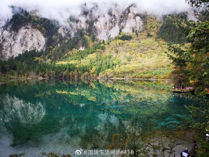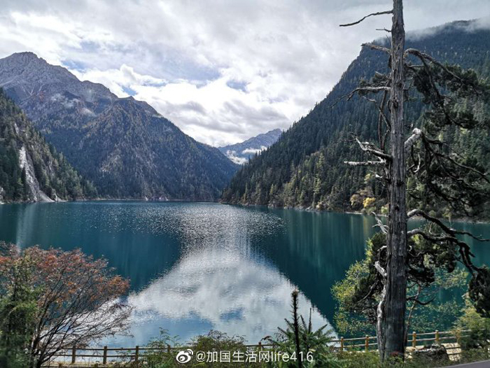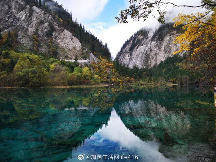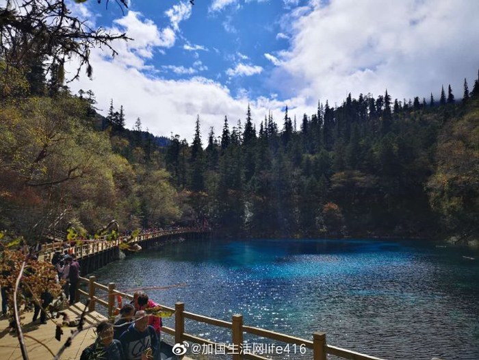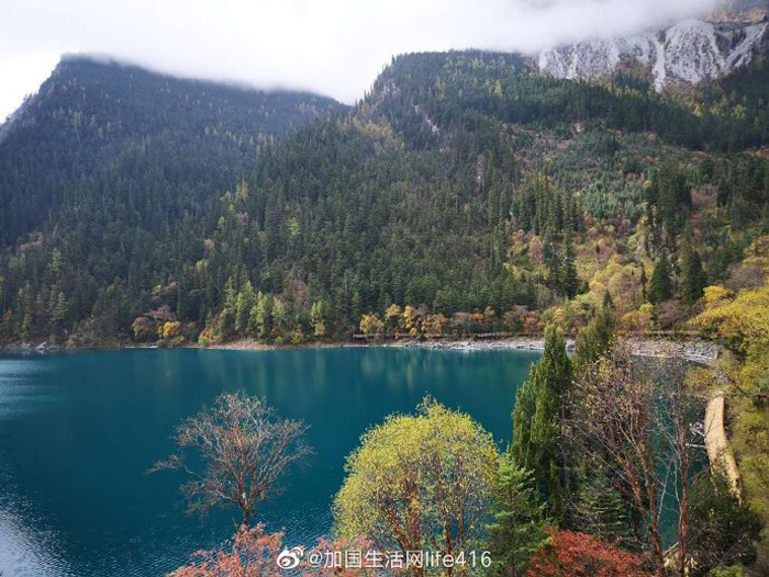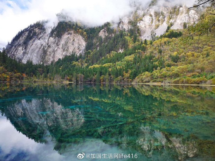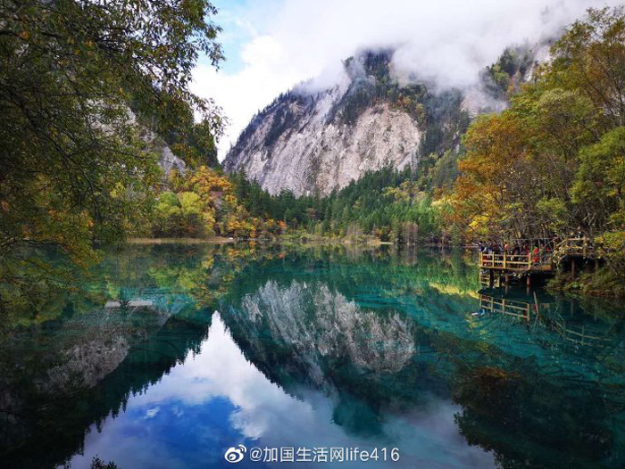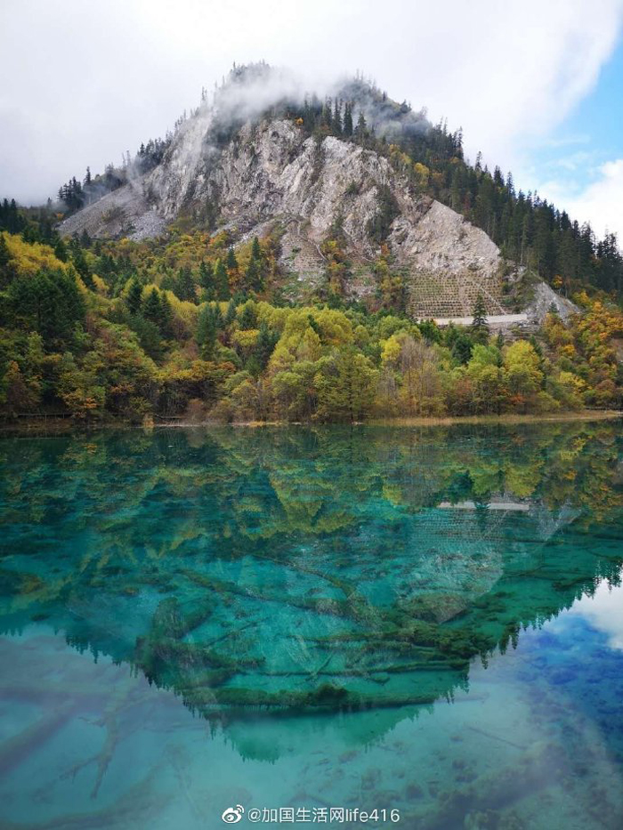 现代肖草《九寨沟》诗:“放眼层林碧水涟,鱼游云顶鸟儿欢。飞流洒落拂衣去,九寨山青誉海天”对九寨沟予以真实的诠释。