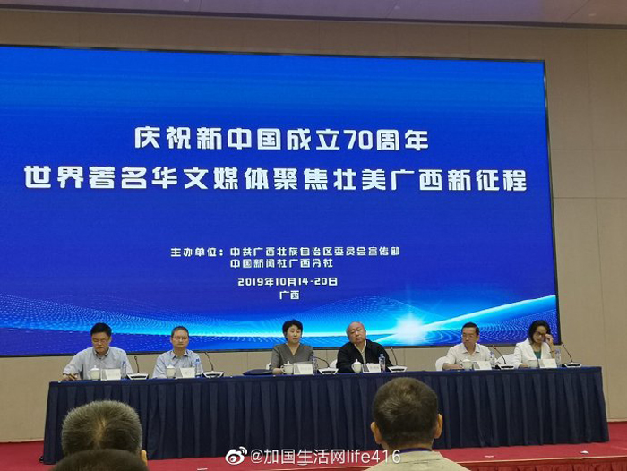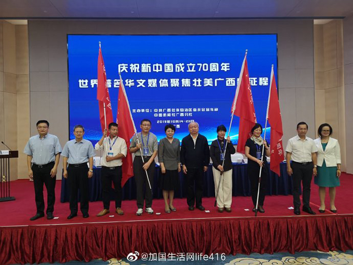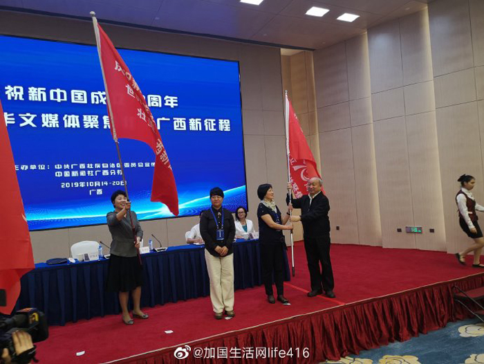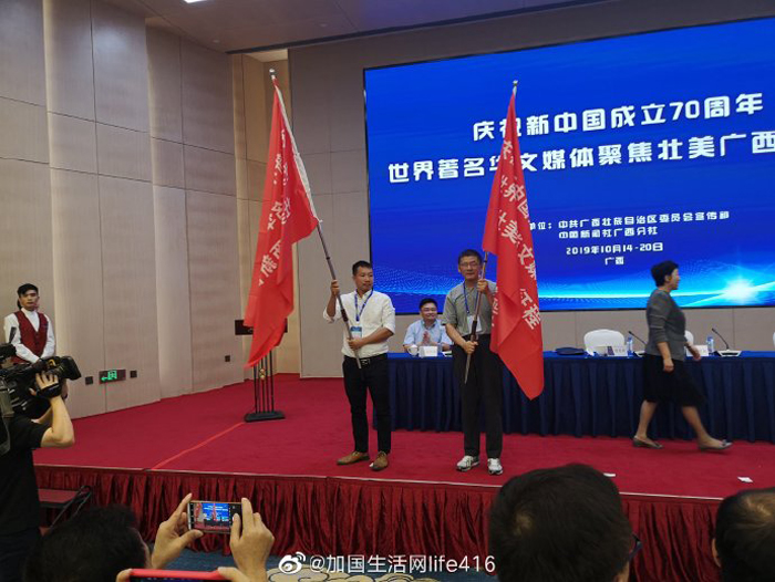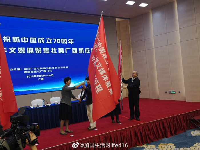 【加国生活网】五洲华媒聚八桂,广西故事成焦点。“庆祝新中国成立70周年·世界华文媒体聚焦壮美广西新征程”活动于2019年10月15日在南宁启动,来自世界五大洲19个国家和地区的42家媒体将零距离感受广西日新月异的新变化。广西壮族自治区党委常委、宣传部部长范晓莉和中国新闻社副总编辑张明新出席启动仪式,致辞并为采访团授旗。