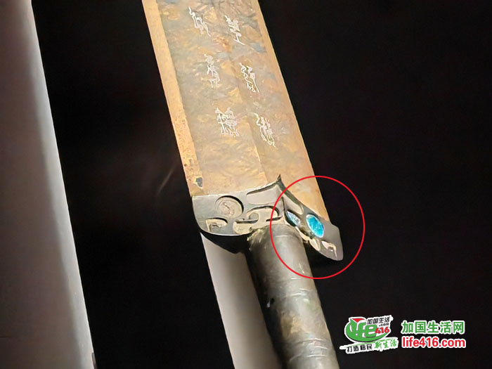 看到上图画红圈的地方,那是越王勾践剑的剑格,那里竟然镶有蓝色玻璃。你可能又会质疑此剑的真假:剑格怎么可能会镶有蓝色玻璃?后人之所以会有这样的疑问,主要是误认为玻璃的制作技术是从海外传入中国的。其实,中国西周至战国时期的玻璃工艺已趋于成熟。越王勾践剑乃王者之剑,剑格正面镶蓝色玻璃,说明玻璃在当时比玉稀有,地位比镶玉剑高贵。