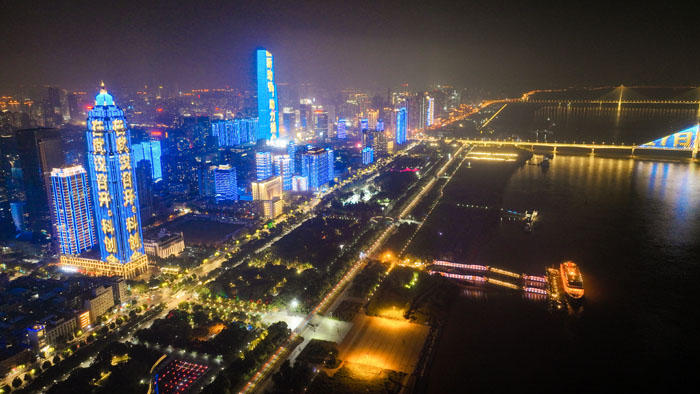 武汉长江沿线璀璨夜景(中新社 吴淘淘摄)