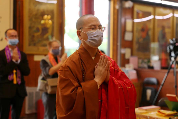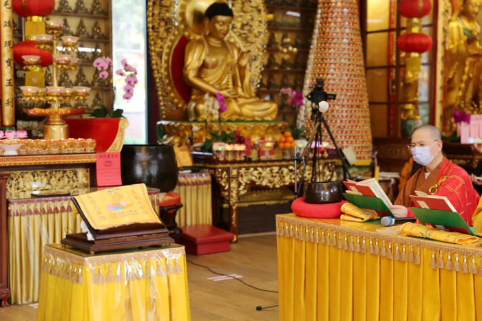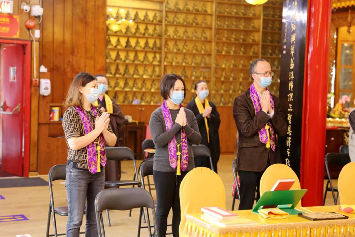 上午9时半,由加拿大佛教会会长、湛山精舍住持达义大和尚在大雄宝殿主法启建地藏王菩萨圣诞法会。大殿内众法师和信众均佩戴口罩,保持安全距离,井然有序。