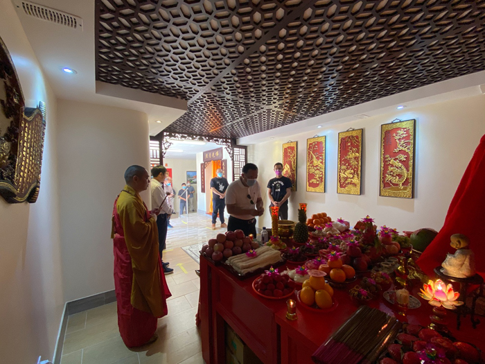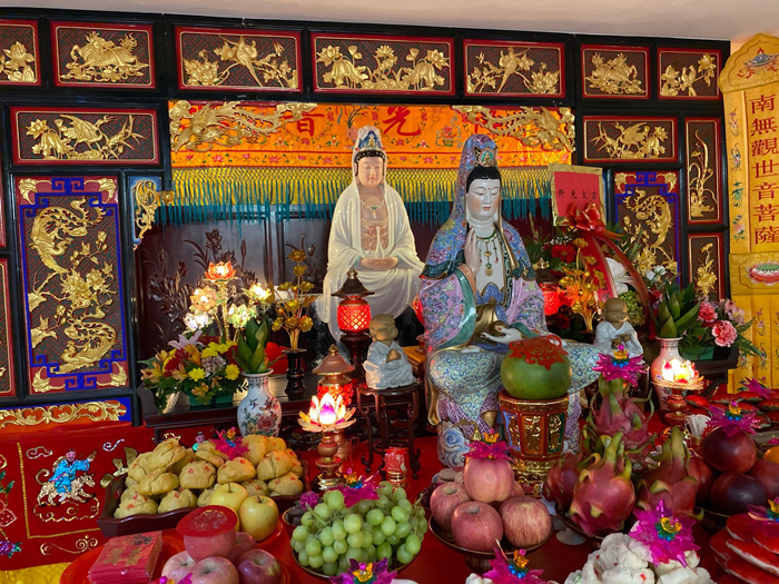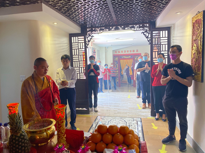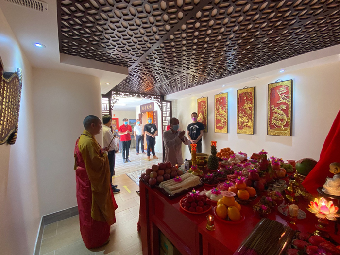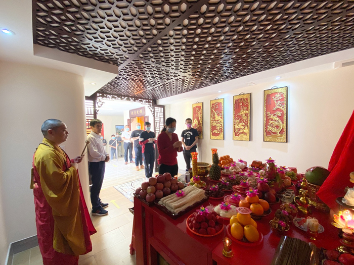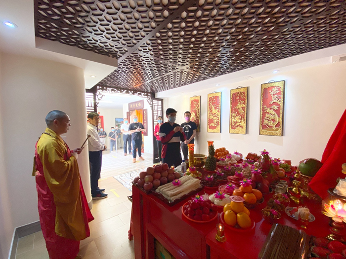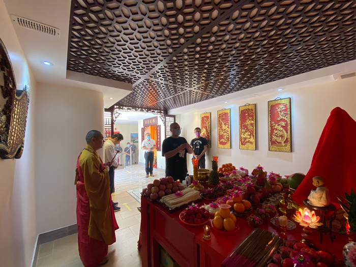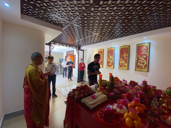 上午9点58分,观音阁内道场庄严,充满法喜,湛山精舍法师主持观音菩萨圣像洒净开光典礼,湛山精舍法师率信众拈香礼佛,持诵经咒,将象征着菩提甘露的净水洒向信众,把美好的祝愿带给大家。防疫时期,妈祖庙及观音阁因受疫情影响,仅限部分功德主参加开光仪式庆典。