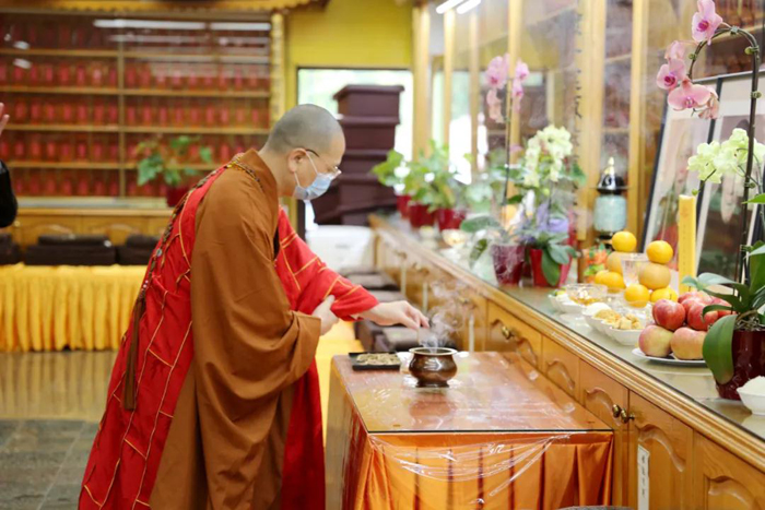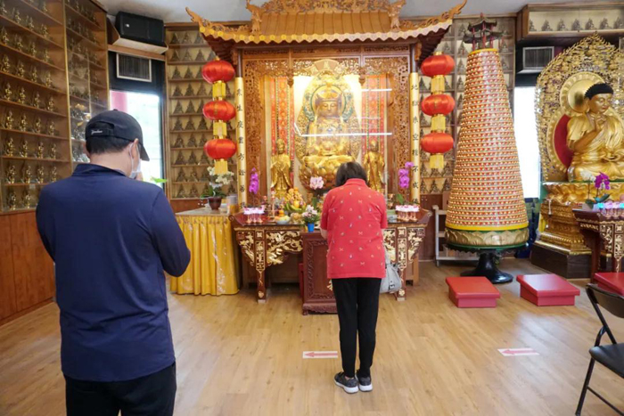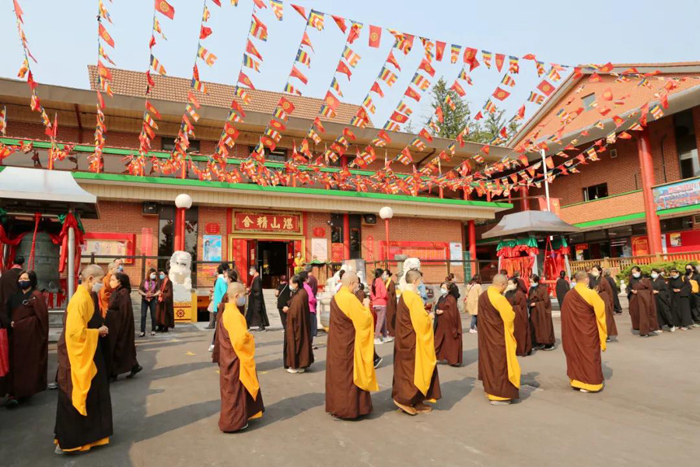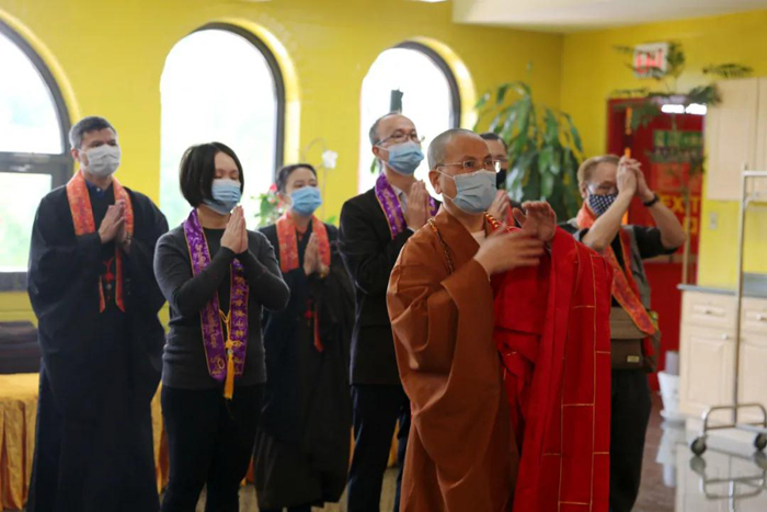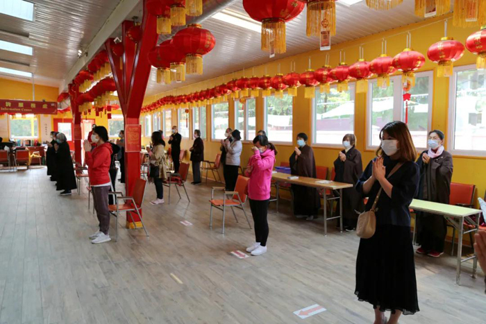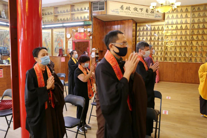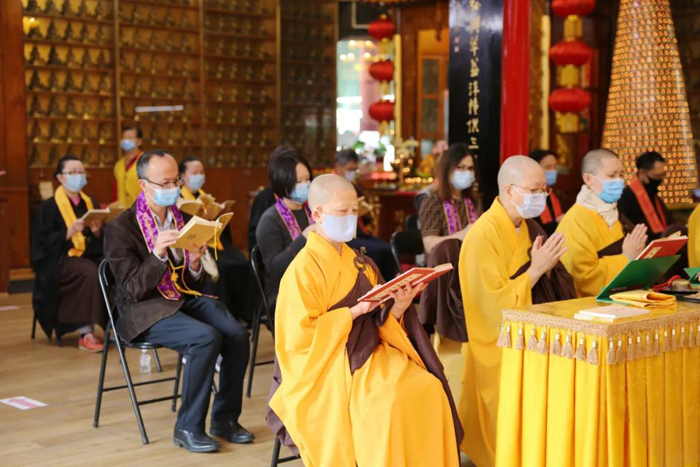 上午9时半,由加拿大佛教会会长、湛山精舍住持达义大和尚在大雄宝殿主法启建地藏王菩萨圣诞法会。大殿内众法师和信众均佩戴口罩,保持安全距离,井然有序。