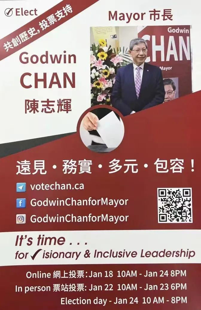 亲爱的Richmond Hill列治文山的朋友们,在1月18日 – 24日期间,列治文山市长大选将开始投票,我们需要陈志辉(Godwin Chan)议员这样优秀人才服务社会。