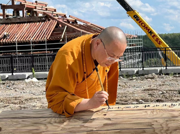 (资料图:早前加国五台山地藏殿举行上梁仪式,达义大和尚在大梁上书写铭文)