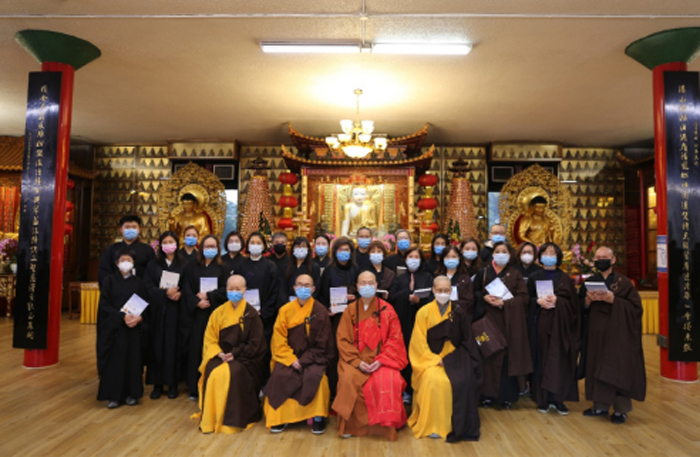 10月14日上午八时,在湛山精舍大殿内,达义大和尚主持皈依法会,向二十二位信众传授三皈五戒,教导信众虽然身在娑婆世界,但需持有一颗清淨、无染污的心,用佛法的智慧和慈悲,照亮未来人生路。