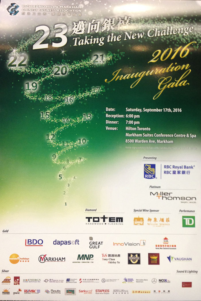 就职晚宴将于9月17日星期六晚上六时假万锦市希尔顿酒店举行,当晚将有超过六百位政商界要人及社区领袖参加,见证华商会新一届会长及会董就任,同时庆祝华商会成立23周年。查询资料及购票,