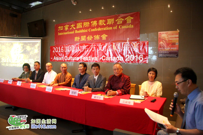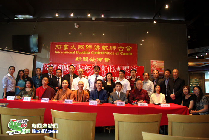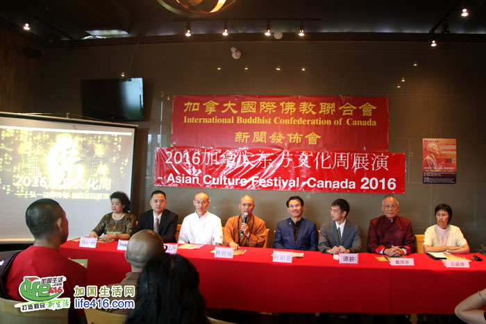 参加新闻发布会的主办方代表有加拿大国际佛教联合会会长照续法师、虚云禅寺住持圣光法师、加拿大少林寺禅武中心负责人延冲法师、净土讲堂住持心印法师;加拿大佛教文化促进会荣誉会长谭仕称、会长David金、副会长Andy、副会长May、理事Ken、理事Cherry、东方文化周总策划Susu。另外还有诸多企业家、商会会长、社区侨领和友好人士来到现场,包括(排名不分先后):万锦市市议员何胡景、加拿大联邦国会议员谭耕办公室的黄志勇博士、中国云祥寺住持觉融法师、五明寺住持蒋阳罗殊法师、加拿大佛教教育基金会会长吴淑瑜、加拿大多伦多华裔媒体工作者协会会长郭然、加拿大华人促进中国统一联盟主席戴国奋、加拿大华商联合会主席林金龙、加拿大华人同乡会联合总会主席俞荧、Li Yang Insurance and Financial Service Inc.总裁杨礼、恒基金融总裁陈汉君、加拿大博瑞集团总裁陈国波、安省华人汽车协会会长Jason张、加拿大智悲利众研修中心负责人王雁龄、皇后金融总裁助理Annie、巴蜀人家董事长秦雯、中国民族时装董事长Helen、上海中医药大学副教授王波等。另外,中国成都乐兮生物科技有限公司罗升华董事长特意从中国发来VCR恭祝东方文化周圆满成功。游本昌老师也特地发来视频祝贺,并亲切得向加拿大观众问好!