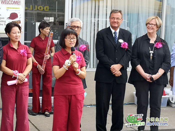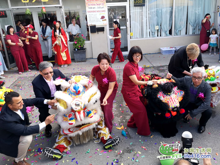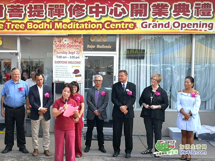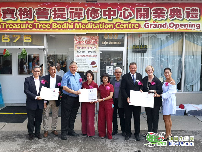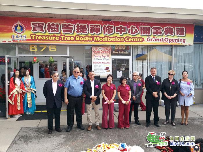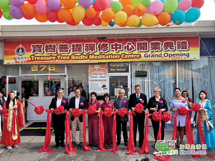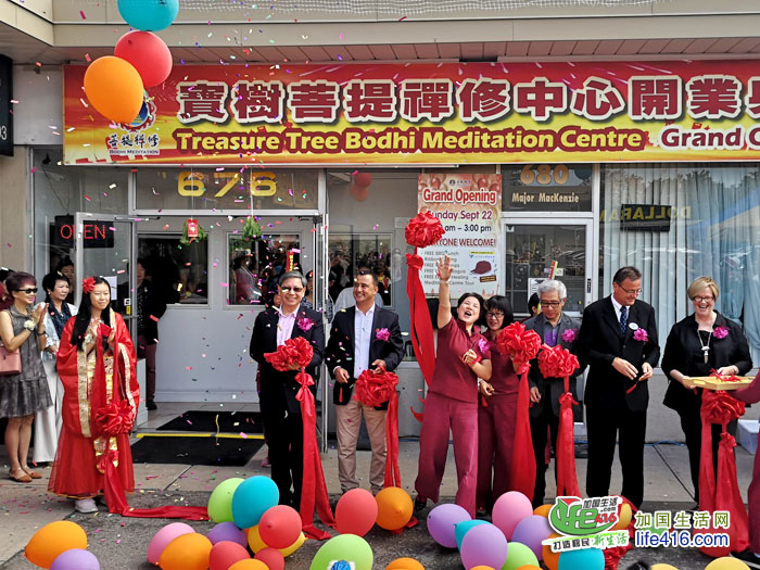 11时正式开业礼,出席剪彩嘉宾包括:多伦多菩提禅修中心负责人法回老师;宝树菩提禅修中心负责人尚闻老师;赞助商Levelwear Canada;CEO & President Mr. Hilton Ngo;Aurora,Oak-Ridges, Richmond Hill MPP Michael Parsa;Richmond Hill Ward 2 Councillor Tom Muench;Richmond Hill Ward 6 Councillor Godwin Chan;Toronto Scarborough-Agincourt Councillor Jim Karygiannis ;Toronto Don Valley North, Councillor Shelley Carroll;Markham ward 6 Councillor Amanda Collucci;Vaughan ward 4 Councillor Sandra Racco。