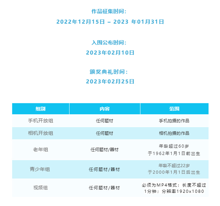 投稿数量:每位参赛者可以最多每个图片类别投稿1-4幅,视频组1-2件,不接受组照。