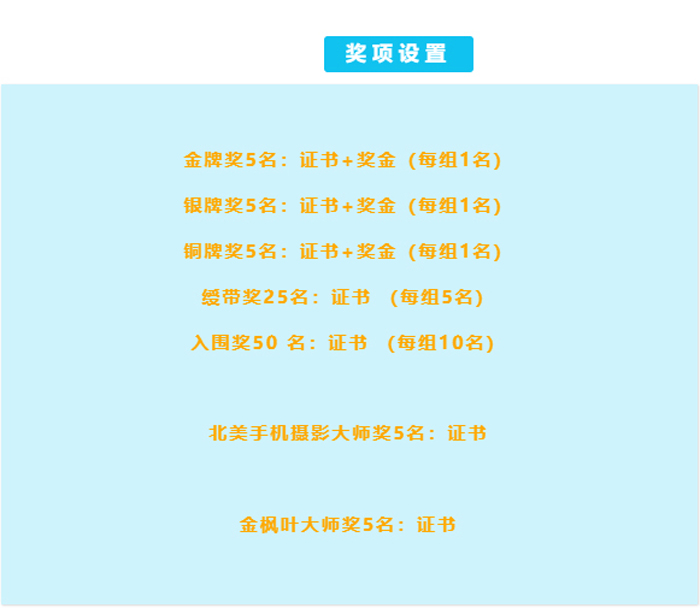 4、所有组别绶带奖及以上获奖者即为“北美手机摄影大师奖”候选人,由网络投票数量按顺序排位,前五位为最终获奖者;