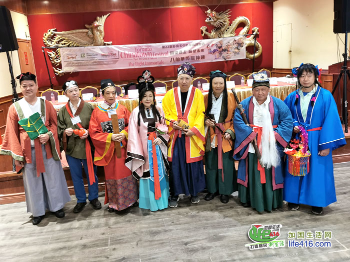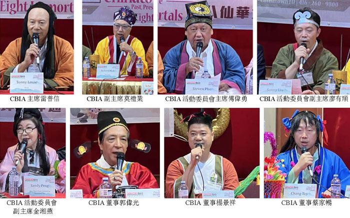 新聞發佈會開始前,由多倫多華埠商業促進區(CBIA)八位董事親自扮演“八仙"人物,包括韓湘子(雷普信)、張果老(莫禮業)、呂洞賓(傅偉勇)、鐵拐李(廖有順)、何仙姑 (金湘燕)、曹國舅(郭偉光)、漢鍾離(楊景祥)、藍彩和(蔡家暢)。“八仙"人物造型維肖維妙,親切熱誠為各位現場朋友帶來歡樂及祝福。