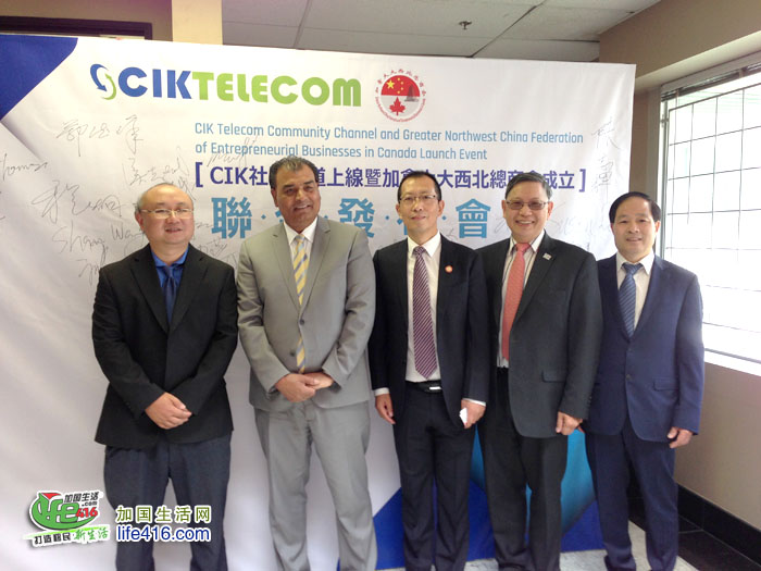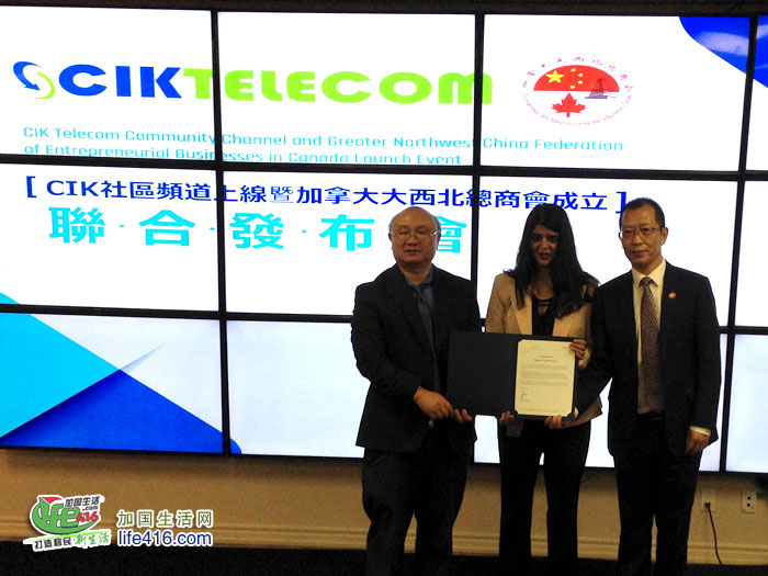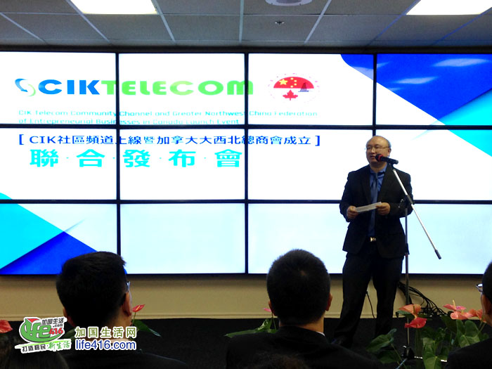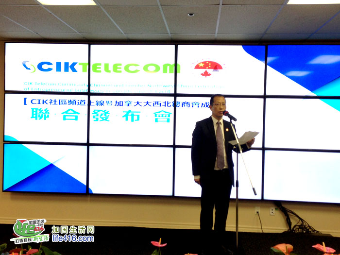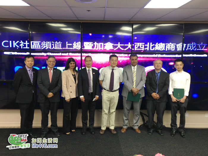 【加国生活网】由CIK电讯公司和加拿大大西北总商会共同举办的“CIK社区频道上线 暨加拿大大西北总商会成立联合发布会”于2018年6月26日上午在CIK电讯总部成功举行。到场的政界嘉宾有国会议员蔡报国,国会议员谭耕的代表黄志勇,列治文山市议员廖立辉、陈志辉,万锦约克郡议员李国贤的代表Neera Chakravorty,中国驻多伦多领事馆商务参赞鄂德锋,加拿大同乡总会执行主席杨申等,同时还有诸多西北籍企业家参与活动,与会人员近百人。