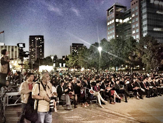 【加国生活网】2016年9月4日,加拿大国家电视台CNTV广场,人山人海,欢乐孩子们游戏着,互闹着,笑意盈盈的爷爷奶奶、爸爸妈妈们三五好友走走聊聊,借着美好月光说说你的家乡我的恋。这是加拿大国家电视台第二届“明月千里寄相思”晚会现场,除了有隆重地产奥斯卡酒会、红地毯、签名墙、还有精彩的文艺演出,日落后的烟花表演更是让这次活动大放异彩!