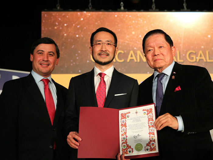 联邦参议员胡子修(Victor Oh)(右)给CPAC会长肖楚强(中)颁发祝贺函,左为国会议员庄文浩(Michael Chong)