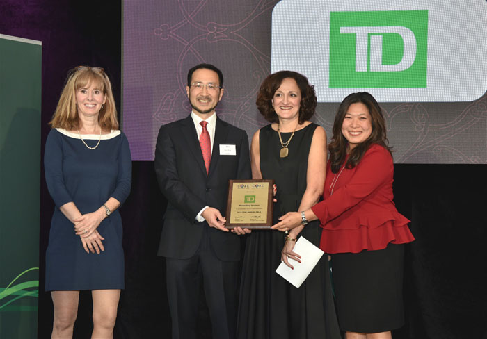 CPAC会长肖楚强(左二)、CPAC基金会理事Marilyn Flanagan(左一)以及国会议员伍凤仪(右一)为晚宴主题赞助商TD Insurance Meloche Monnex代表Anna Kavanagh(右二)颁发感谢牌匾