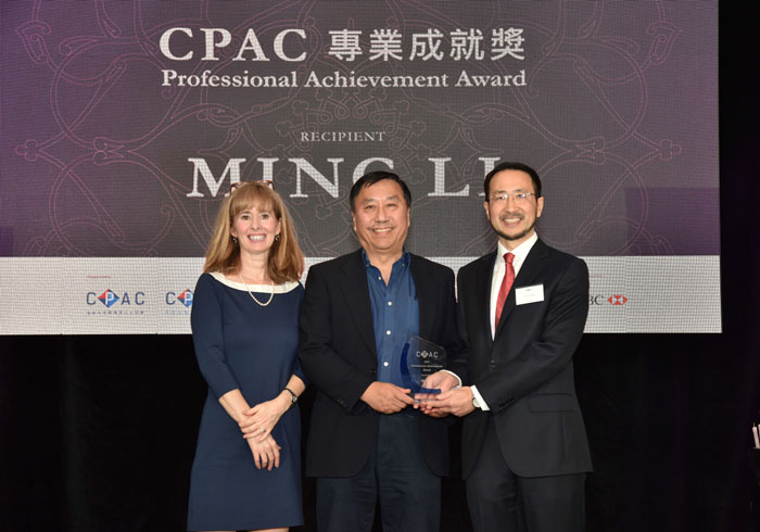 CPAC会长肖楚强(右)及CPAC基金会理事Marilyn Flanagan(左)为2017 CPAC“专业成就奖”获奖者李明博士(中)颁奖