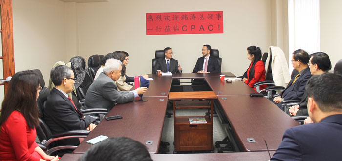 CPAC会长肖楚强(Eric Xiao)对韩涛总领事一行专程访问CPAC表示感谢,并简单介绍了CPAC的组织结构,在服务移民社区方面所做的工作、服务项目及活动,以及CPAC在维护社区利益和推动中加交流等方面的努力。