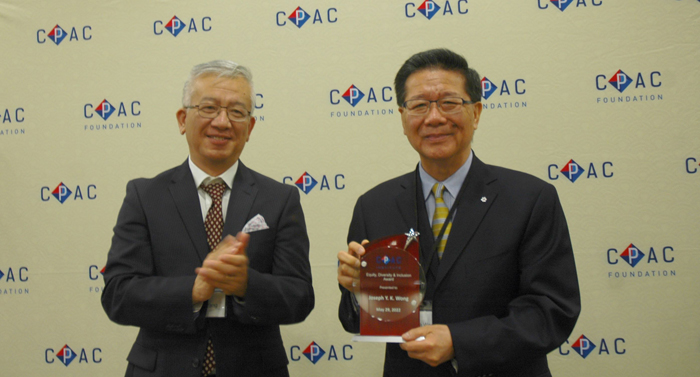 CPAC会长王体博士为王裕佳(Joseph Y. K. Wong)医生(右)颁发首届公平多元共容奖