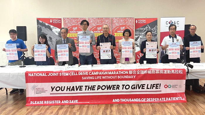 加拿大现有约一千个垂危病者在急切等候适当的干细胞移植,让生命得以延续。可惜暂时都未能找到适合慨捐赠者。华人社区组织现继续联手,协助加拿大血库举行“募捐干细胞运动”,鼓励年龄在17至35岁的华人踊跃参加登记,以便找到能够与其匹配的干细胞,拯救垂危病人。登记者可能就是成功救人的捐赠者、救星。参加登记只需用绵花棒擦擦口腔,采集口腔细胞,全无痛楚。整个登记过程仅需时约10分钟。
