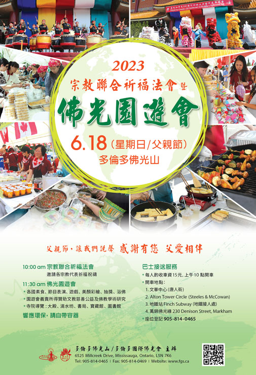 过去三年,新冠疫情为社会造成了多方面的影响,但佛光人仍积极面对,并关怀社区、大众;随着防疫措施的解封,多伦多佛光山、多伦多佛光会秉持“以文教弘扬佛法,以慈善福利社会”之宗旨,同时亦响应联合国后疫情时代重启、复原的呼吁,再度携手协作,以“蔬食环保护地球 父爱相伴亲子游”为主题,欢喜呈现多伦多佛教界年度盛事“宗教联合祈安法会暨佛光园游会”。