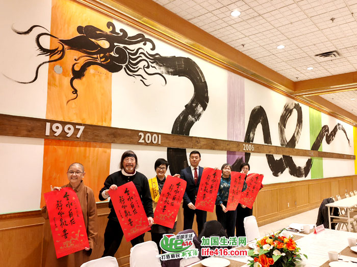 左起多伦多佛光山住持觉凡法师、太极笔墨艺术家何家强、国际佛光会多伦多协会会长何美宝、副会长曹峰岩、副会长范瑞珍、秘书长江可儿,邀请大众参加龙年新春系列活动