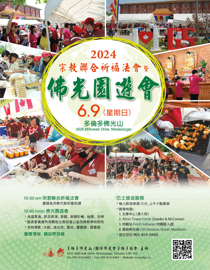 【加国生活网】多伦多佛光山和国际佛光会多伦多协会联合主办的“2024宗教联合祈福法会暨佛光园游会”,6月9日将于密西沙加市多伦多佛光山盛大举行,预计将迎来数以千计的社区人士参加。