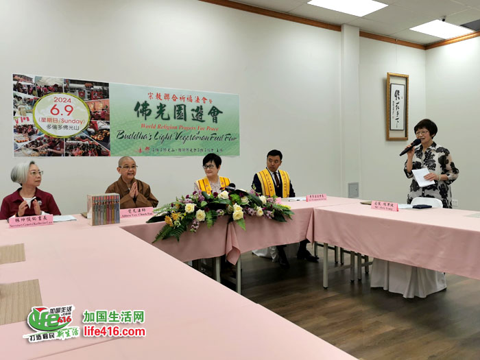 多伦多佛光山和国际佛光会多伦多协会于2024年5月21日举行新闻发布会宣布“2024宗教联合祈福法会暨佛光园游会”将于6月9日举行,“2024宗教联合祈福法会暨佛光园游会”记者会,多伦多佛光山住持觉凡法师、国际佛光会多伦多协会会长何美宝(),副会长曹峰岩(右一)、秘书长林坤仪共同主持。