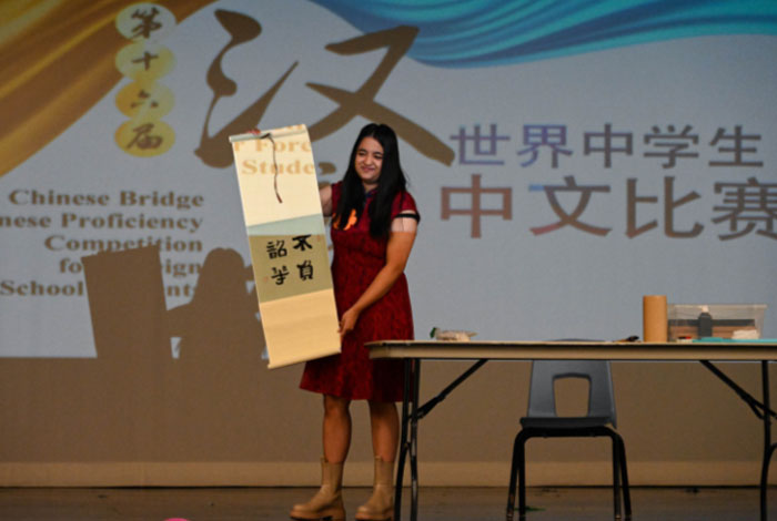 中学生选手李浩欣(Kelly Hof)在演讲中,分享了自己通过学习中国舞学会了中文的成功经验;任晨曦(Zarah Rizvi)则用自己最工整秀美的毛笔书法,证明了自己坚实的汉语功底。