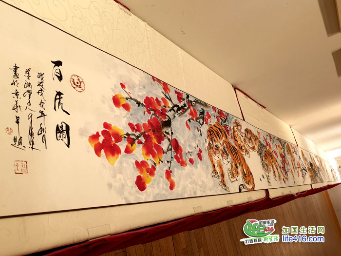 在剪彩仪式结束后,大家纷纷和邢老师合影留念,在二楼的展厅里,摆放着邢老师的40多幅作品,以及一副长40米的百虎图,为了一睹为快,大家自动举起作品,向前移动,20多人在大厅里绕一圈还没有完全展开,最后大家继续移动,整卷作品展现在大家的眼前,场面非常震撼,这百只虎以写意手法所描绘,或立或卧、或行或扑、或嬉或警、或惕或戏,形态各异、栩栩如生,令人叹为观止。同时展出的还有一副9米的作品。