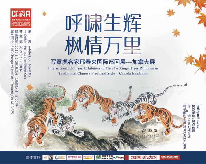 【加国生活网】由加中艺术文化交流协会主办的“呼啸生辉 枫情万里--写意虎名家邢春来国际巡回展加拿大展”画展开幕式将于2019年3月2日下午2:00-4:00于大多伦多中华文化中心隆重举行。