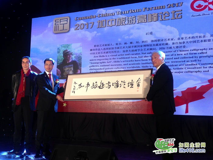 加拿大中国艺术联盟意象书画家,加拿大新时代杰出艺术家石甫向2017加中旅游论坛赠与书法作品