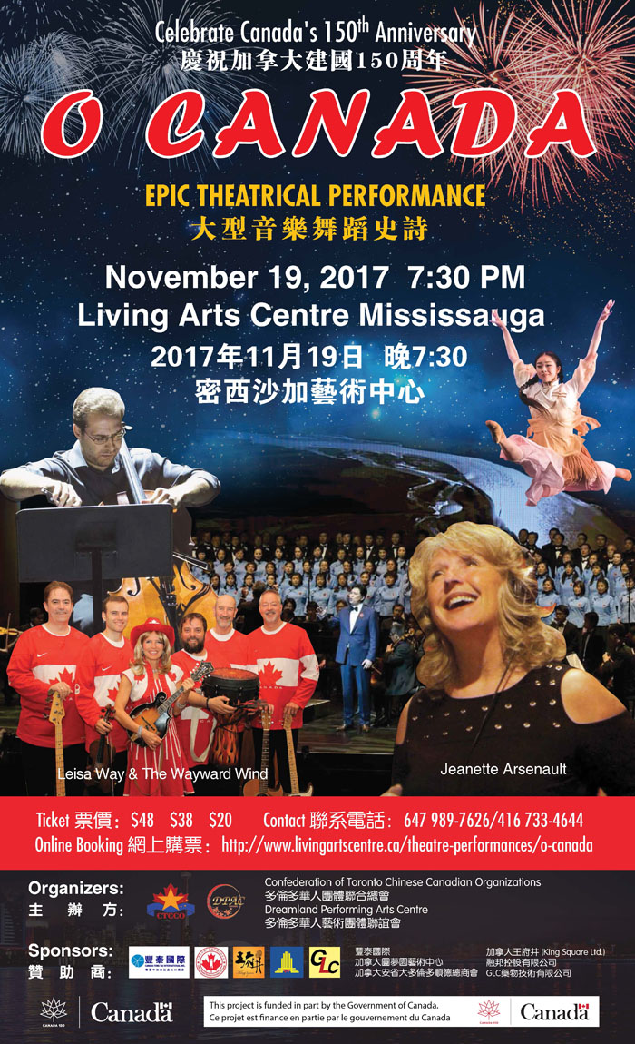 大型音乐舞蹈史诗“O,Canada”,是由多伦多华人团体联合总会和多伦多华人艺术团体联谊会共同主办的庆祝加拿大建国150周年大型系列活动的压轴大戏,是继成功举办锦绣中华民族歌舞晚会、拉斯曼广场千人庆典、万锦广场国粹艺术汇演、多伦多市政厅主题摄影展以及“我爱加拿大”征文比赛等之后的又一巨作,是“和平颂”原班人马邀请加拿大一些著名制作人联手打造,既有多伦多知名华裔导演的原创作品,又有广为流传,蜚声加拿大的优秀节目,各族裔专业演出团体强势加盟,其鲜明的多元文化特色以及超前的艺术手段,都将开辟一个舞台作品的新纪元。