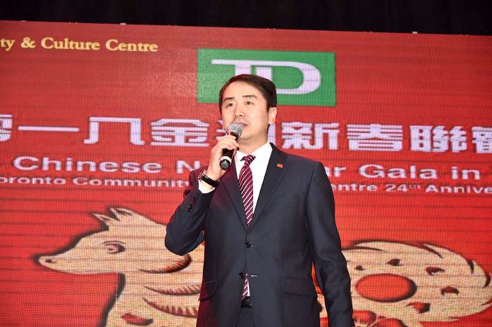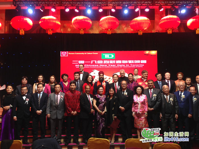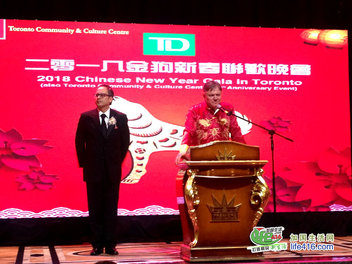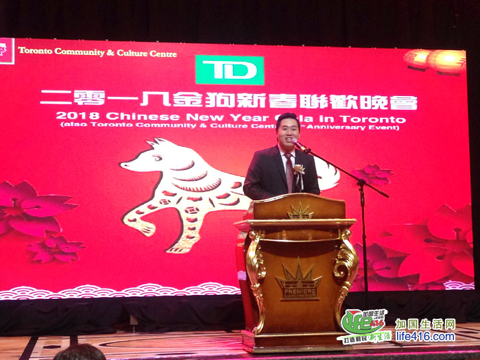 【加国生活网】多伦多社区与文化中心于2018年2月10日烈治文山的钓鱼台国宴举行2018金狗新春联欢晚会,这次是该中心第24年举办大型春节活动,同时为国语社区服务筹募经费。中国驻多伦多总领事何炜、加拿大三级政要包括联邦众议员陈圣源、关慧贞、蔡报国(Bob Saroya),多伦多副市长黄旻南、市议员詹嘉礼(Jim Karygiannis)、旺市市议员杨士渟等代表等近千人参加活动。