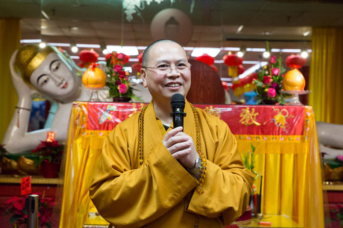 达义大和尚说:在这辞旧迎新之际,我代表加拿大佛教会性空长老和湛山精舍全体常住感谢社会各界特别是新闻界对湛山精舍和加国五台山工程的发心支持!过去的一年,是加拿大佛教会成立五十周年。天随人愿,喜事连连。过去的一年,加国五台山大雄宝殿上梁大典圆满举行,仿唐大雄宝殿初具雏形,五台山东台文殊师利菩萨圣像开光,北美弘法中心呼之欲出。我们还成功举办了加中佛教文化交流周暨佛教雕版书画展,启建了声势浩大、庄严隆重的第三届水陆法会,影响深远,意义非凡。