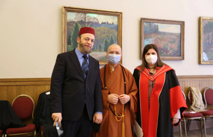 会后,达义大和尚与校方代表及博士代表和伊斯兰教的领袖Dr.Hamid Slimi.Imam合影留念。并亲切与多大下属的维多利亚大学的校监Nick Saul、Emmanuel College(伊曼纽尔学院)的校长Dr.John H.Young、荣誉博士获奖人Alia Hogben和Tanya Kristine Talaga(现在 Globe and Mail 西报主笔)讨论当代人类的心理、信仰和社会等感兴趣的问题进行愉快的交流,同时邀请与会嘉宾到加拿大佛教会湛山精舍和加国五台山参访。