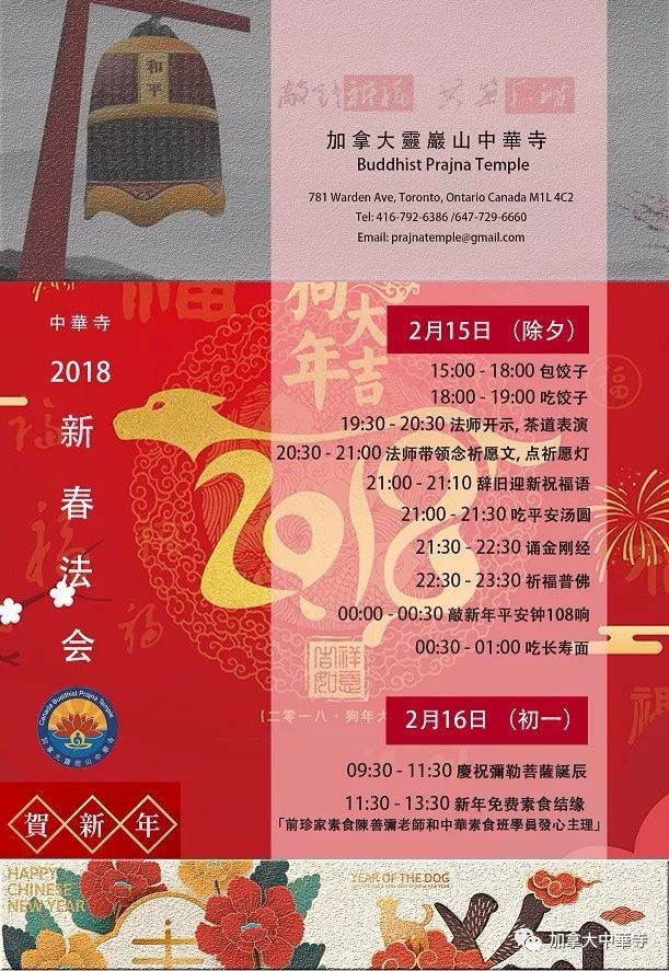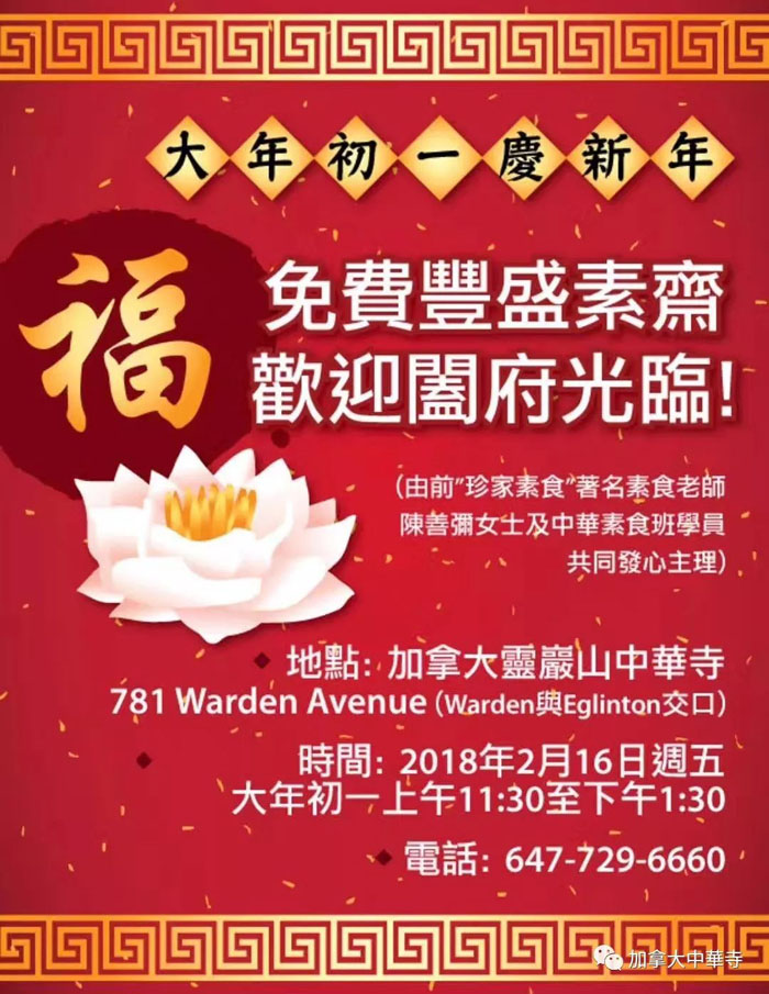 为使十方善信广植福田、得成所愿,加拿大中华寺将于今年除夕良宵举行辞旧迎新撞钟、祈福法会, 点灯祈福、敲钟许愿、品茶论道、中华风味小吃等,内容精彩纷呈,欢迎您合家前来同沾法喜,祈愿佛光普照,家庭安乐、社会和谐、平安吉祥,诸事如意;并为社会的祥和,经济的繁荣,世界的和平而求三宝加被,佛光注照,故恳邀阖府拈香礼佛,同沾法益,共享法乐!