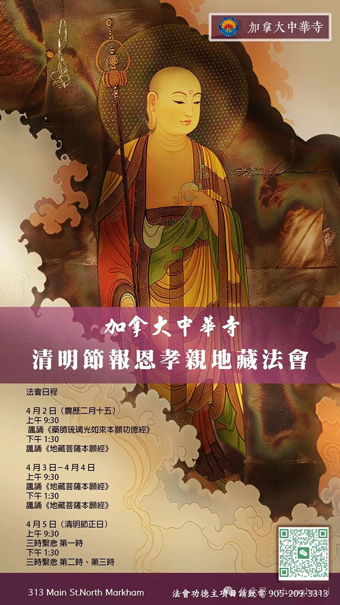【加国生活网】加拿大中华寺将于2024年4月2日至4月5日举行《地藏菩萨本愿功德经》暨《三时系念》法会回向超荐历代父母、宗亲,往生净土、莲品增上;并且回向健在父母双亲、师长身体健康长寿、恒久住世,六亲眷属平安顺利吉祥!