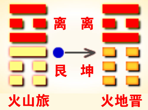 白云道长又将那女子扶起,带她来到一张桌子前,桌子上有一碗水,道长以手指蘸水,在桌子上画了一卦“火山旅”道:“香主请看,此卦上卦为离卦属火,下卦为艮卦属土,离火生艮土,艮为止,为高山,为拦路石,本不可为之,但若第三爻从阳变成阴……”