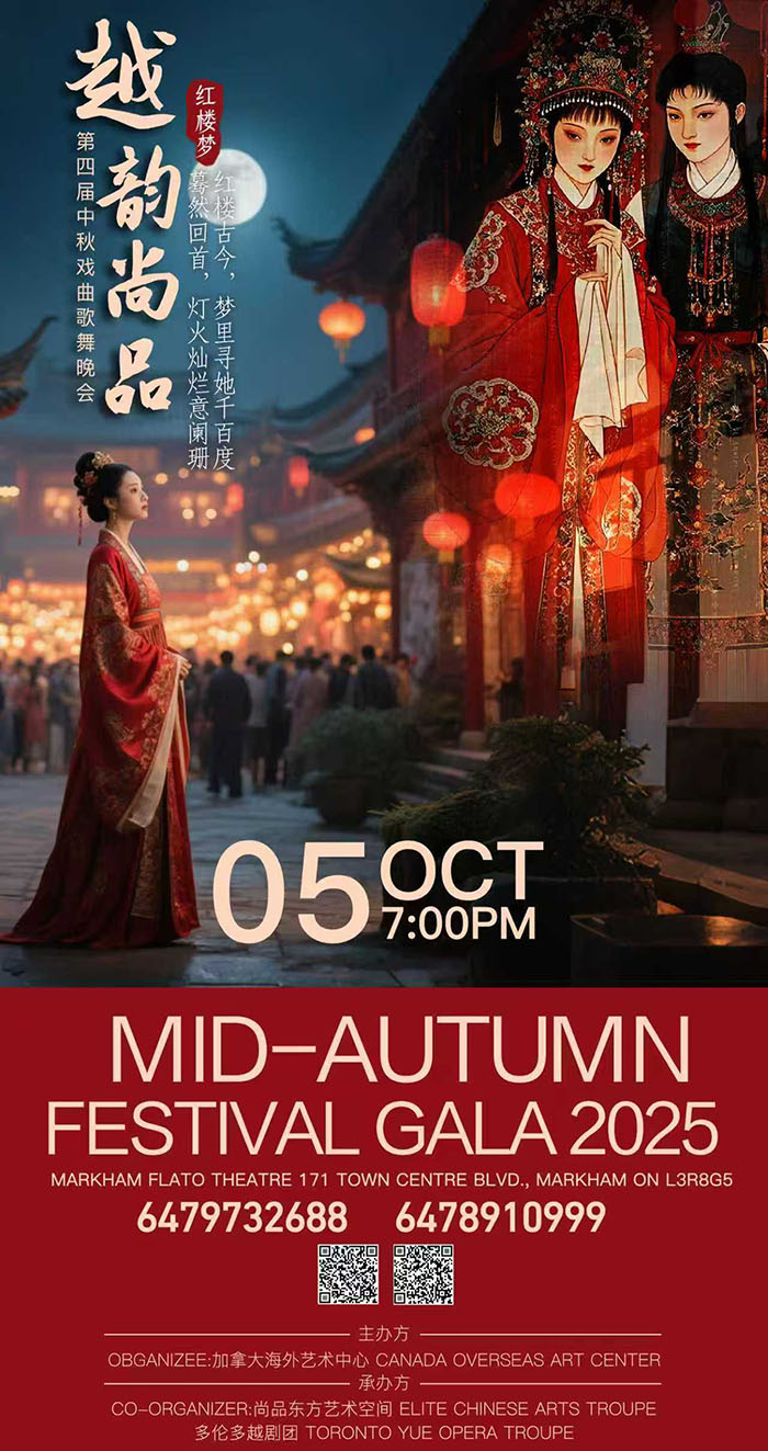 10月5日当晚,由“多伦多越剧团”携手“尚品东方艺术空间”倾力打造的第四届“越韵尚品”中秋戏曲歌舞晚会将于晚7点在Markham Flato Theatre隆重上演。本场晚会以中国古典文学巅峰之作 《红楼梦》 为艺术灵感,在舞台上勾勒出 梦幻与现实的交织、古典与当代的对话。观众将在诗情画意的氛围中,感受红楼人物的悲欢离合,也将在歌舞戏曲的交响里,体味现实生活的真情与共鸣。