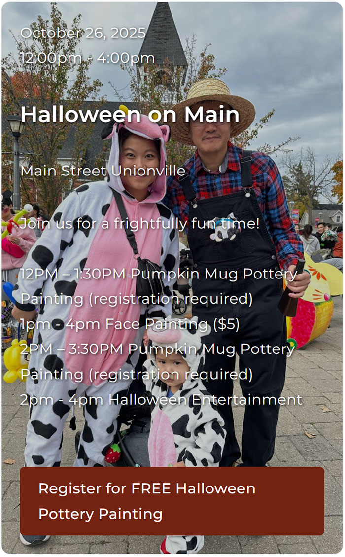 【加国生活网】万锦Unionville小镇的Main Street 将会在本周日全部装饰成万圣节的“恐怖”景象,欢迎小孩子们挨家挨户上门trick-or-treat。届时,万锦Uniionville 小镇的Main街将会封路,孩子们除了可以到各个店铺trick-or-treat 外,小镇还将举行一系列有意思的万圣节活动,包括: