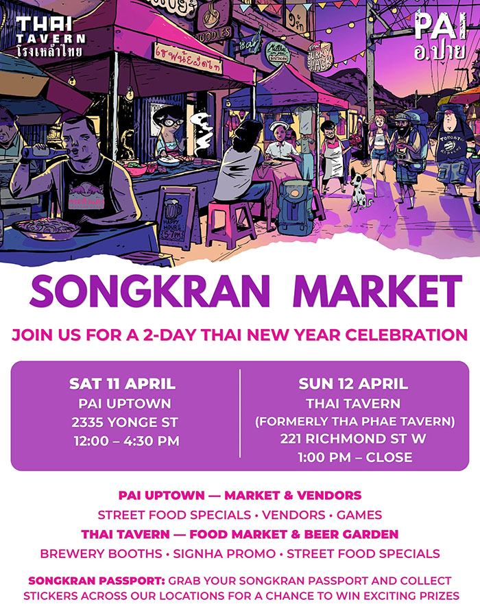 地址2:THAI TAVERN(Food Market & Beer Garden)— 221 Richmond St W, Toronto, ON 点击查看Google地图网址:https://paitoronto.com/songkran-market