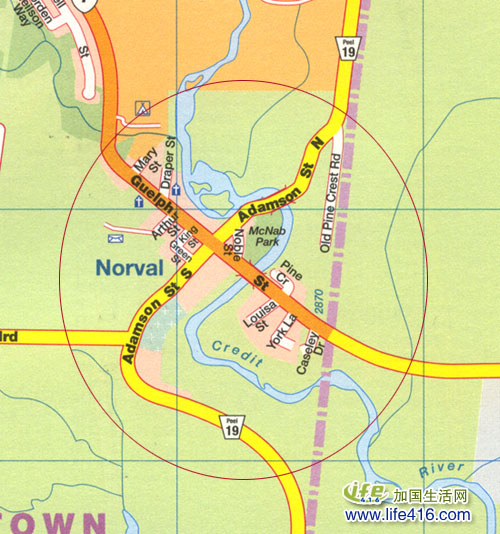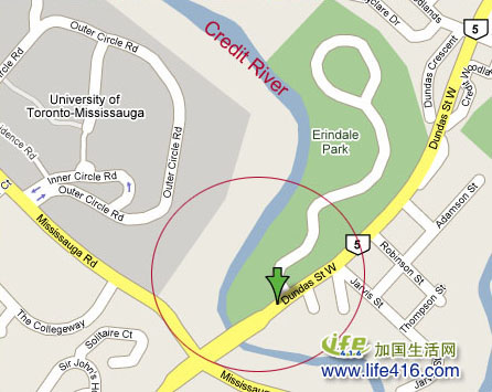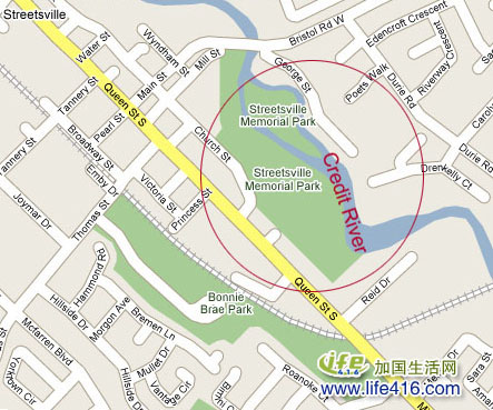(2)Mississauga Rd和Eglinton Ave West交界处,沿Mississauga Rd向北开(此时这条路改名为Queen St. S),至Main St.,就能开到Streetsville Memorial Park,这里的Credit River能看到三文鱼回游。