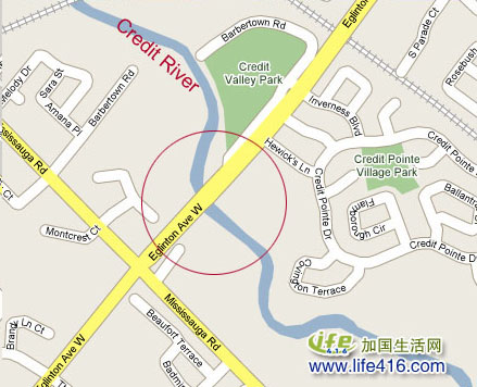 (1)Mississauga Rd 和Eglinton Ave West 交界处,沿Eglinton向东走一段距离的Credit River。
