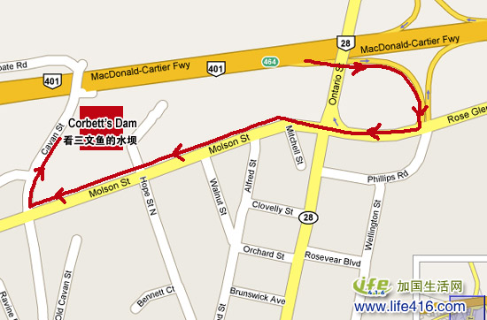 沿着Moison St. 开到Cavan St. (路中央有个黄灯一闪一闪的)向右转,在这条小路上大约有200米的样子,会看到眼前有个401的桥洞,不要过桥洞,因为看三文鱼的停车场就在右手边。停好车,往前一走就是一座水坝,这里就是观赏三文鱼洄游的终点Corbett's Dam。